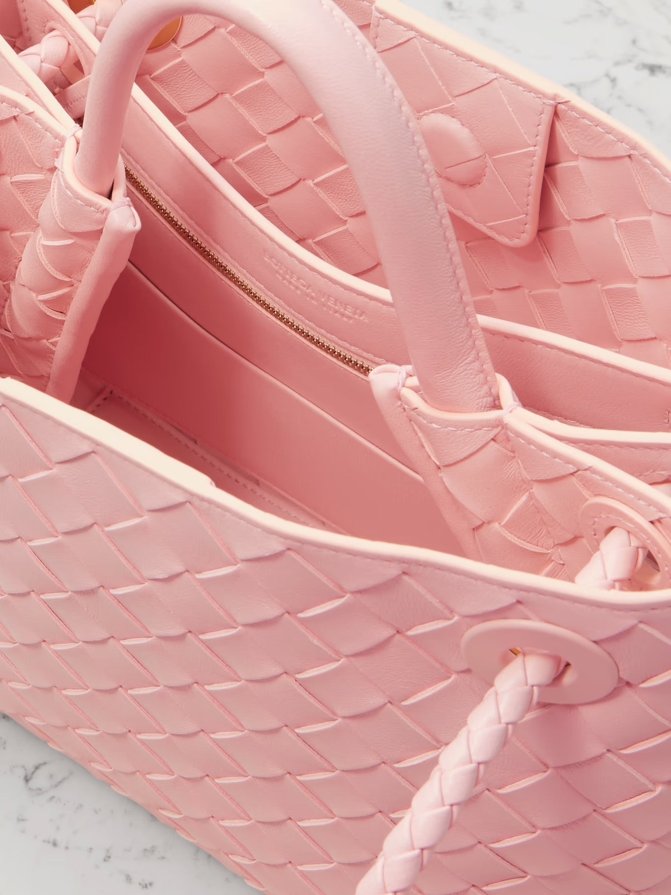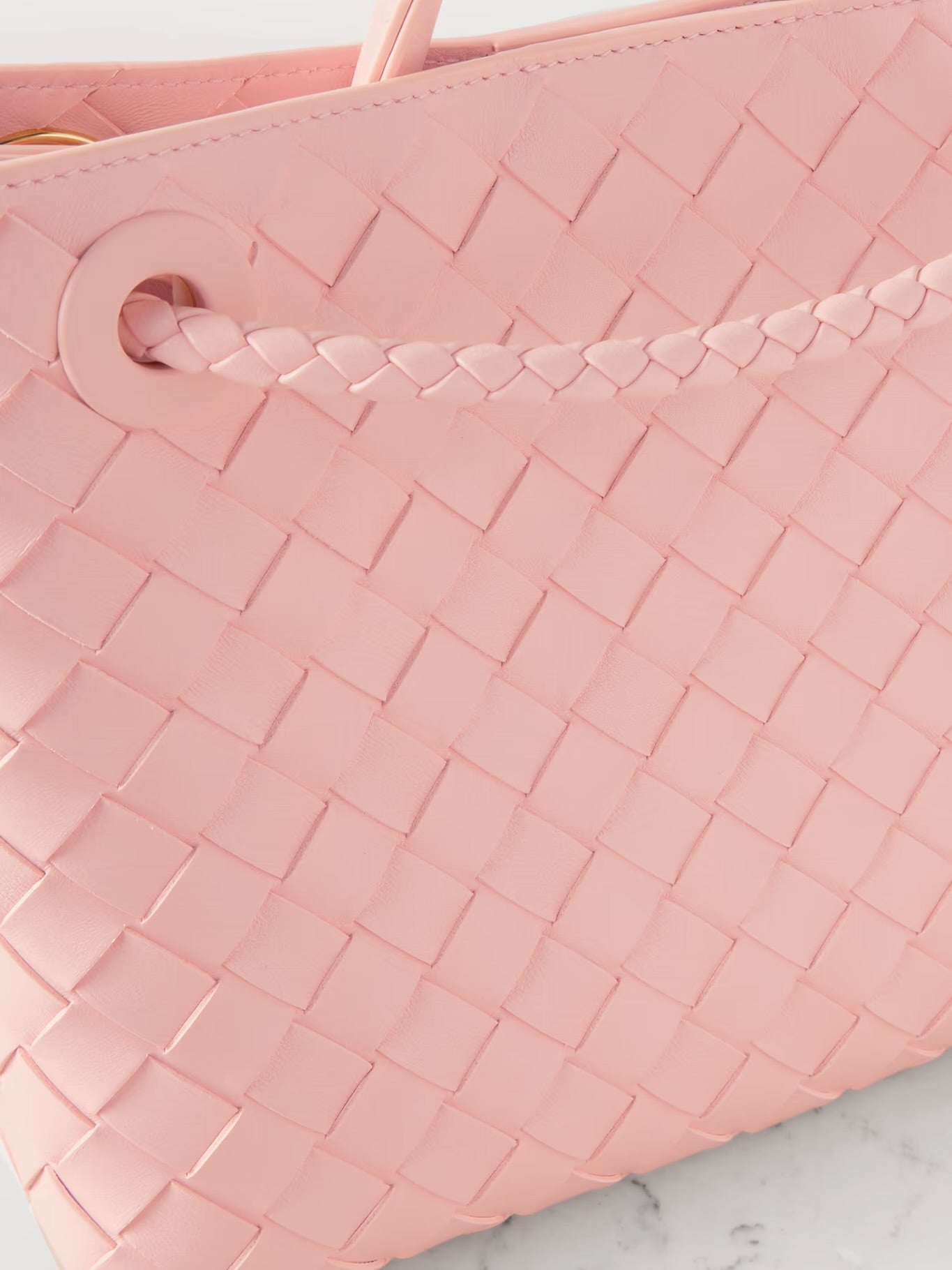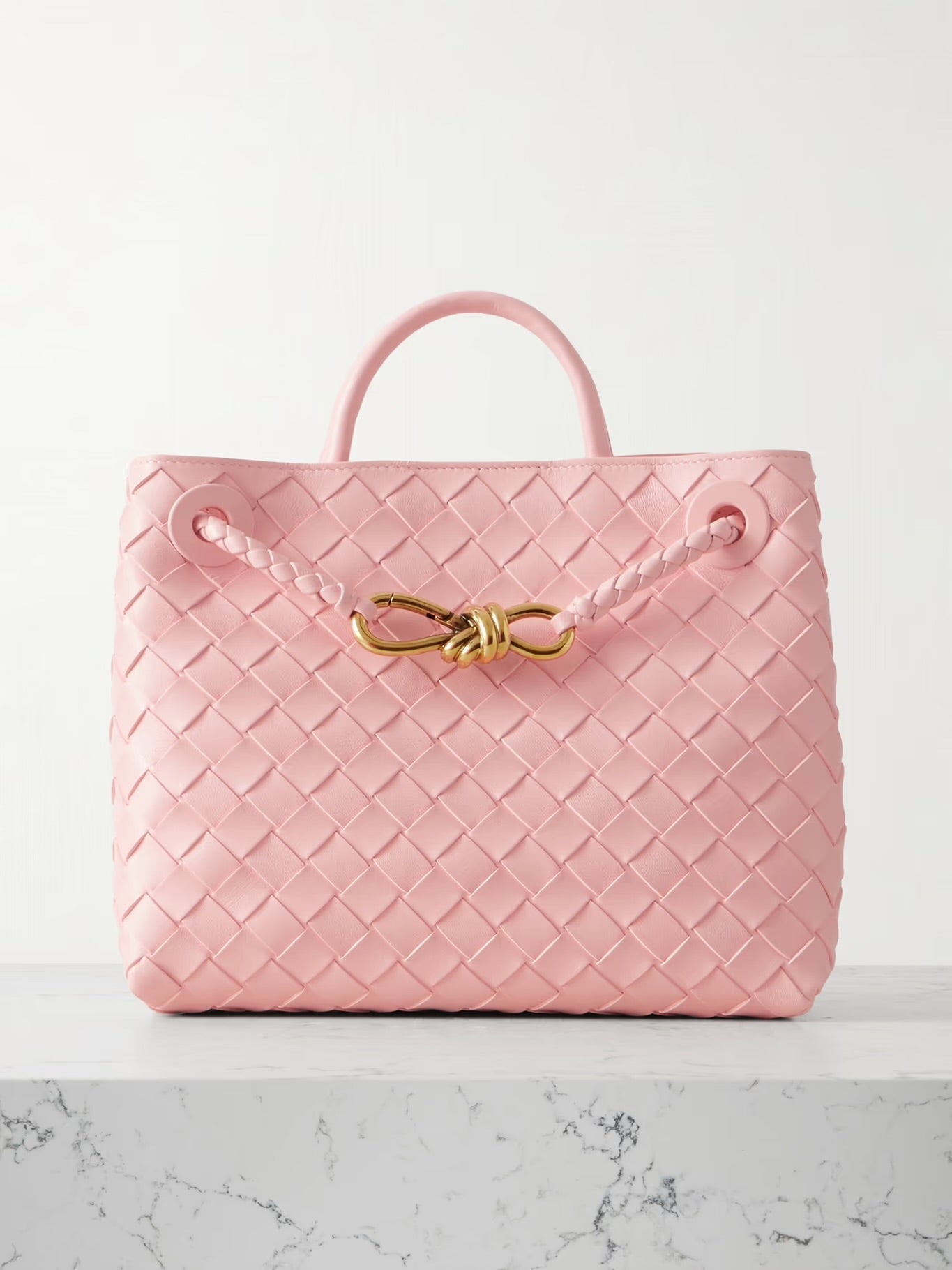 Bu zarif rosé renkli çanta, stil sahibi kadınlar için mükemmel bir aksesuardır. İkonik, elde örülmüş deseni çantaya özel bir doku kazandırırken, ön kısımdaki dikkat çekici altın renkli düğüm kapama, şık bir odak noktası oluşturur.
