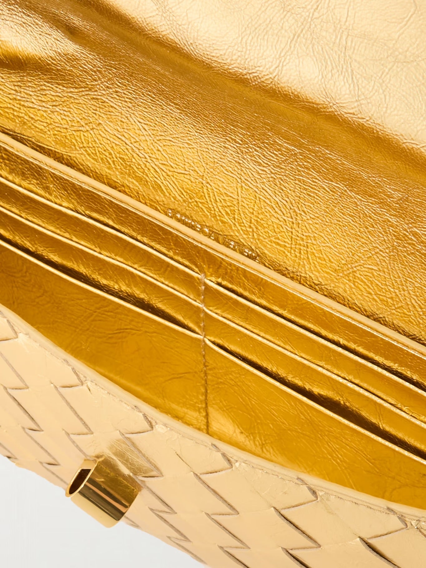 Bu özel clutch çanta, zamansız zarafeti modern bir incelikle buluşturuyor. Işıltılı altın rengindeki deriyle ustalıkla elde örülmüş tasarımı, çantaya son derece şık ve sofistike bir görünüm kazandırıyor – özel davetler veya günlük şık kombinler için mükemmel bir seçim.